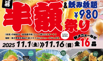 串鳥本町店(仙台)は2025年11月1日(土)に、新たに≪串鳥番外地≫としてスタートします!番外地おなじみの海鮮・焼き野菜を極めた新スタイルにリニューアルいたします。特別企画と致しまして11/1(土)~11/16(日)の16日間は●新メニューを含む全16品半額セール●単品飲み…