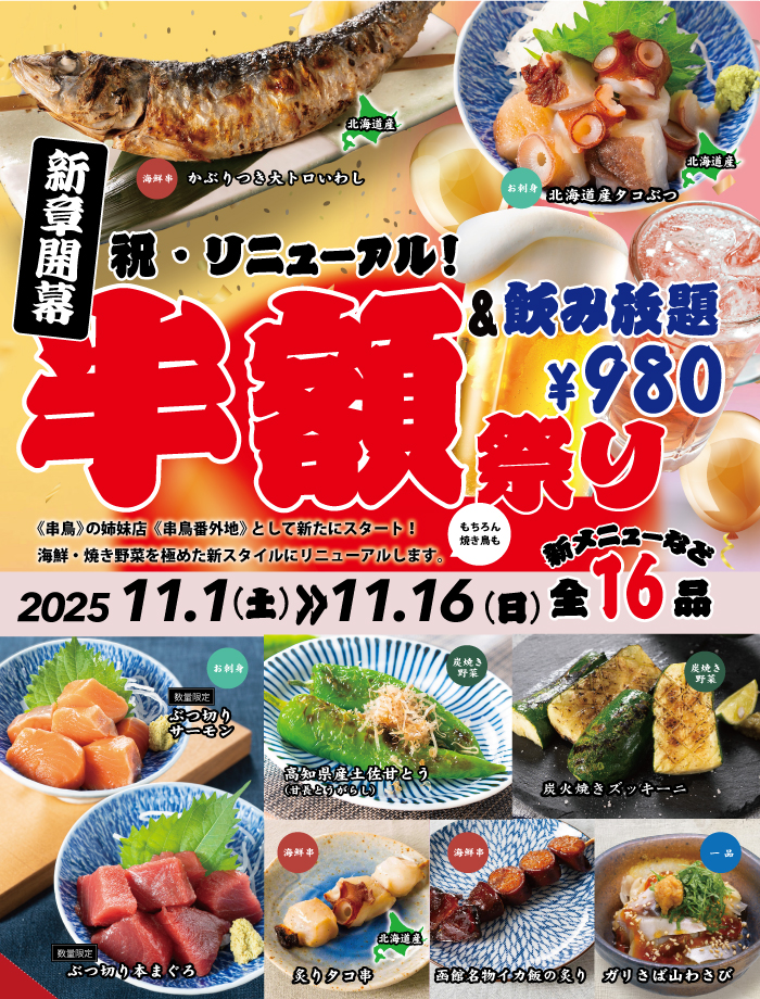串鳥本町店(仙台)は2025年11月1日(土)に、新たに≪串鳥番外地≫としてスタートします!