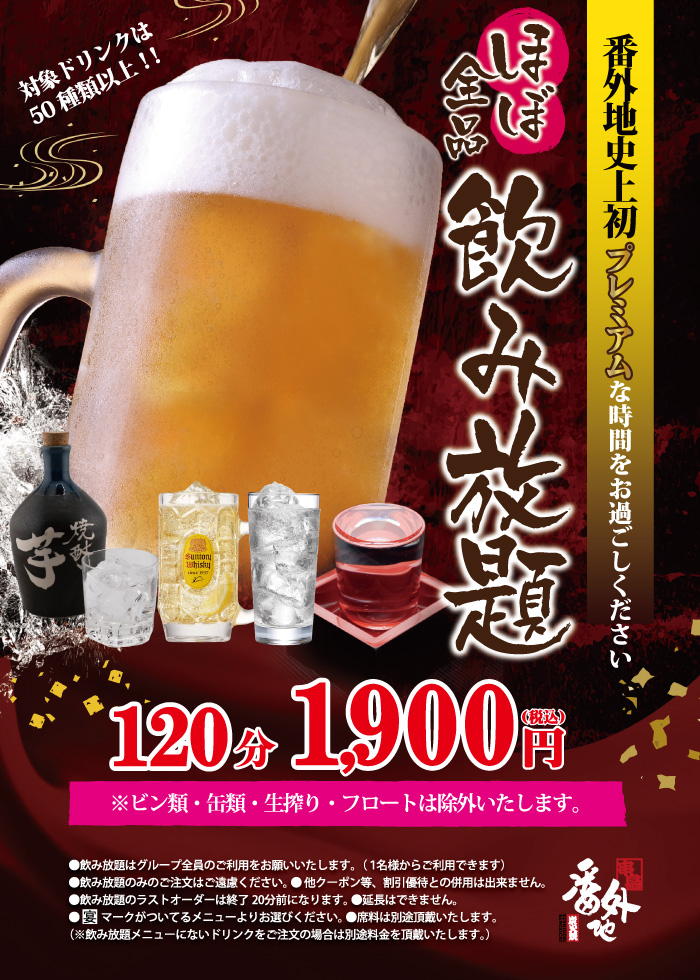 ●飲み放題のラストオーダーは終了20分前になります。 ●グラス交換制になります。